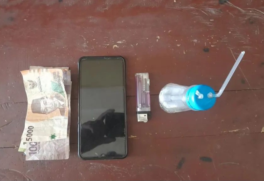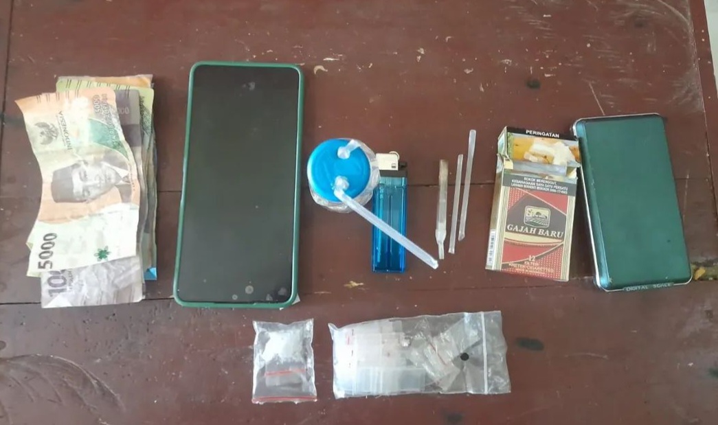 Dari hasil penggeledahan, petugas menyita sejumlah barang bukti antara lain, paket narkotika jenis sabu, alat hisap lengkap (kaca pirex, dll), timbangan digital warna hijau, dua unit handphone merek Vivo, uang tunai Rp94.000 dan plastik klip kosong