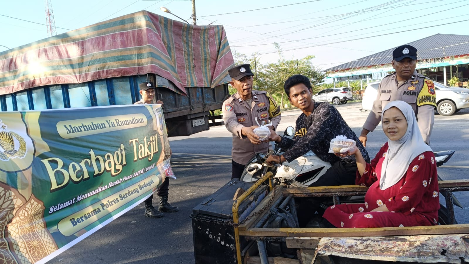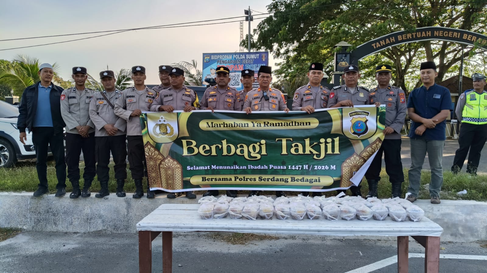 SERGAI (Waspada.id): Jelang waktu berbuka puasa Ramadhan 1447 Hijriah, jajaran personel Polsek Teluk Mengkudu bersama Polsek Firdaus membagikan sebanyak 100 paket takjil kepada pengendara yang melintas di depan Mako Polres Serdang Bedagai, Selasa (3/3/2026) sore.