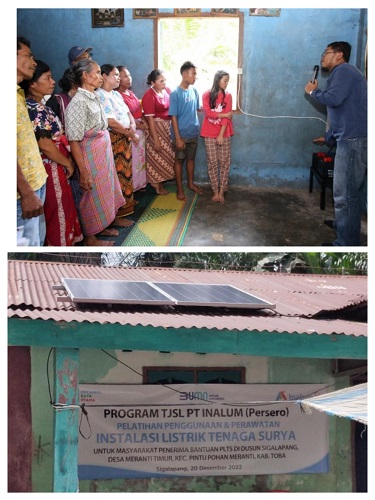 TOBA (Waspada) : PT Inalum (Persero) memberikan hibah Pembangkit Listrik Tenaga Surya (PLTS) kepada 11 rumah masyarakat yang belum mendapatkan fasilitas listrik di Dusun Sigalapang, Desa Meranti Timur, Kec. Pintu Pohan Meranti, Kab Toba, Selasa (20/12) lalu.