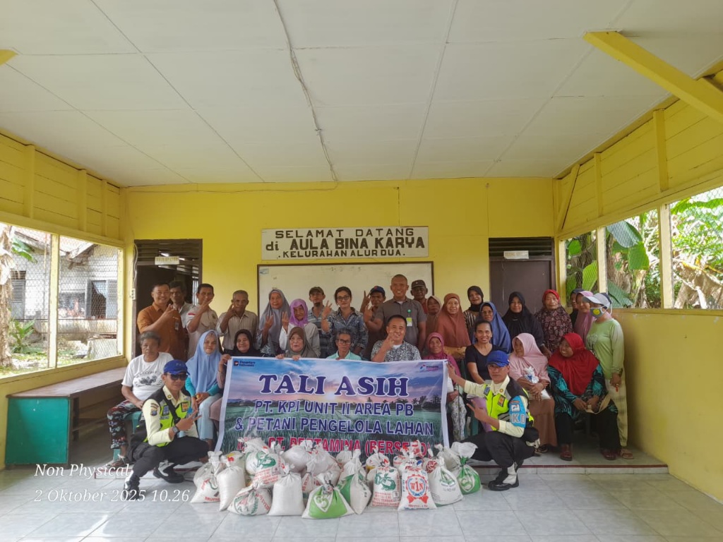 P.BRANDAN (Waspada.id): PT Kilang Pertamina Internasional (KPI) RU II Area P.Brandan dan kelompok tani pengguna lahan PT Pertamina RU II P.Brandan membagikan tali asih kepada 43 orang kaum dhuafa di Aula Kantor Kelurahan Alur Dua, Kec. Sei Lepan, Kamis (2/10/25).