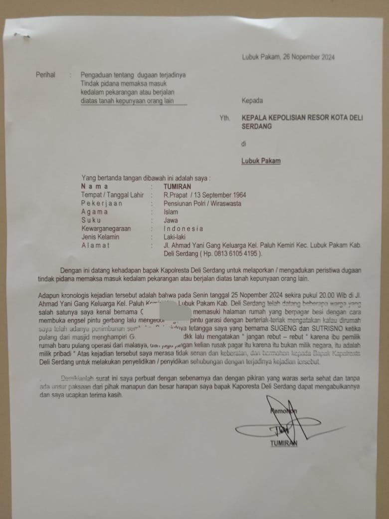 DELISERDANG (Waspada): Tumiran, 60, melaporkan dugaan tindak pidana berupa pemaksaan masuk ke areal rumahnya di Jalan Ahmad Yani, Gang Keluarga, Kelurahan Paluh Kemiri, Kecamatan Lubukpakam, Kabupaten Deliserdang yang dilakukan GS.