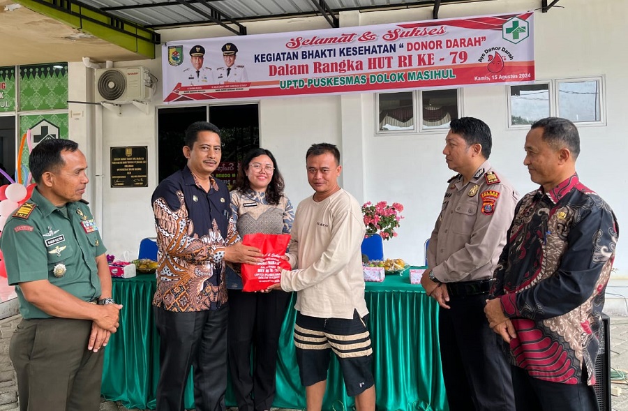 DOLOKMASIHUL (Waspada): Dalam rangka menyemarakkan HUT ke-79 RI, UPTD Puskesmas Dolokmasihul bekerjasama dengan Muspika menggelar acara bakti sosial (Baksos) donor darah, Kamis (15/8) kemarin di Puskesmas, Kel. Pekan Dolokmasihul Kec. Dolokmasihul.