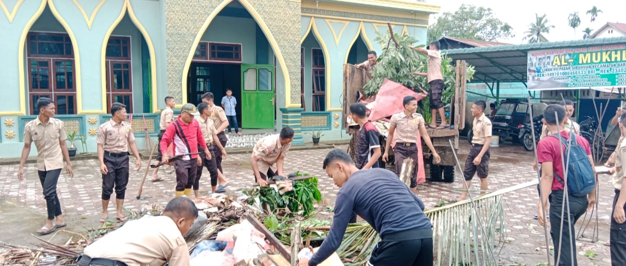 SIBUHUAN (Waspada): Relawan Pramuka peduli kwartir cabang (Kwarcab) Kabupaten Padang Lawas (Palas) bantu membersihkan rumah korban banjir di Batang Taris, Kelurahan Pasar Sibuhuan Kecamatan Barumun.