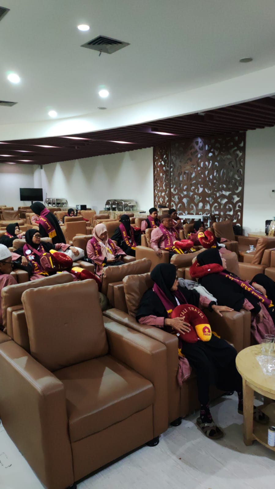 Puluhan jemaah umrah berasal dari Sumatera Utara, Pekanbaru dan Bekasi ini ditempatkan di Saphire Lounge KNIA sebelum diberangkatkan ke tanah suci.