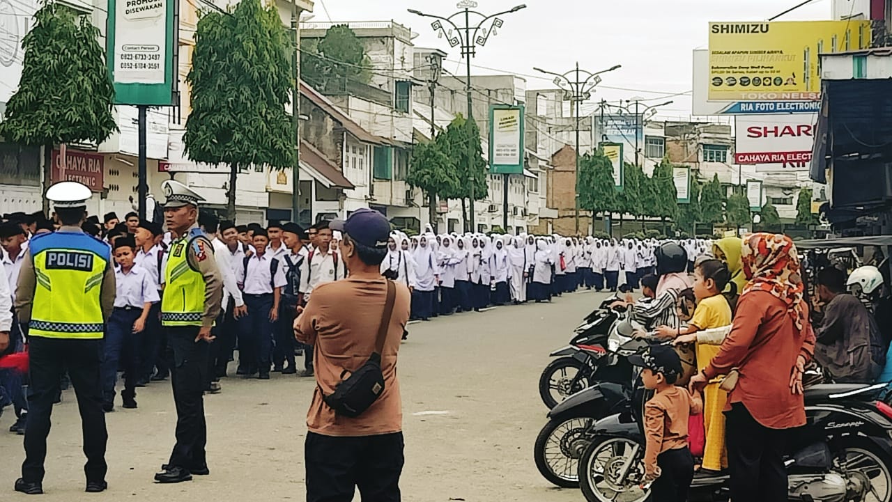 RANTAUPRAPAT (Waspada): Ribuan pelajar dan ibu-ibu pengajian pawai Muharam mengitari kota Rantauprapat memeriahkan Tahun Baru Islam 1445 Hijriah, Rabu (19/7).