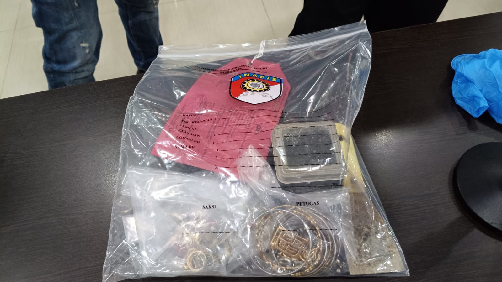 Dalam pengungkapan kasus ini, polisi turut mengamankan sejumlah barang bukti, di antaranya satu unit handphone merek Oppo warna hitam dan satu lembar surat pernyataan penitipan anak. Selain itu, ditemukan pula barang bukti lain berupa sekrap gagang kuning, kotak perhiasan, lima kalung, empat cincin, 19 gelang, 37 anting, lima bros, 17 manik-manik, serta lima jarum pentol.