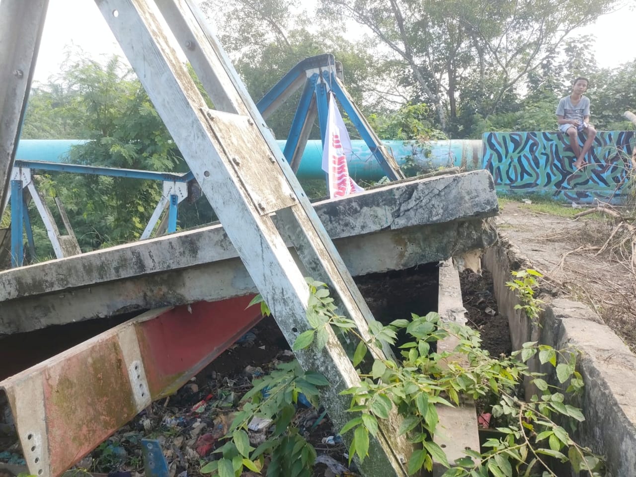 Kondisi jembatan memang rusak dan tak bisa dilintasi. Warga setempat memasang spanduk bertuliskan: jembatan rusak, mobil dan dum truk dilarang melintas. Sekeliling jembatan diberi pembatas, bagian depannya ditumpuk ranting pohon. Melongok ke bagian bawah jembatan, banyak besi dan baut yang raib. (a16/a01)