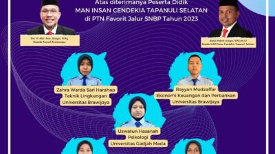 TAPSEL (Waspada) : Sebanyak 5 orang peserta didik (siswa) Kelas XII Madrasah Aliyah Negeri Insan Cendekia (MAN IC) Kabupaten Tapanuli Selatan (Tapsel) diterima Perguruan Tinggi Negeri (PTN) favorit melalui jalur Seleksi Nasional Berdasarkan Prestasi (SNBP) tahun 2023.