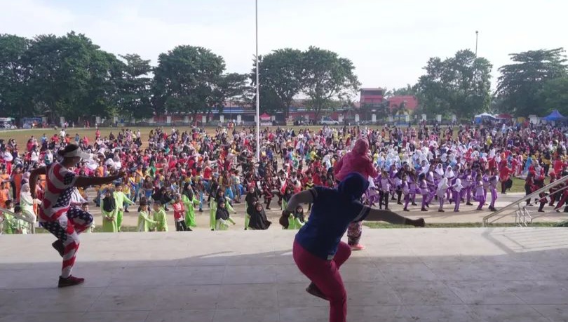 Anak-anak bergerak lincah mengikuti irama musik, menularkan aura positif kepada semua yang hadir. Mereka menari, bertepuk tangan, melompat, dan tertawa lepas dalam irama hidup sehat.