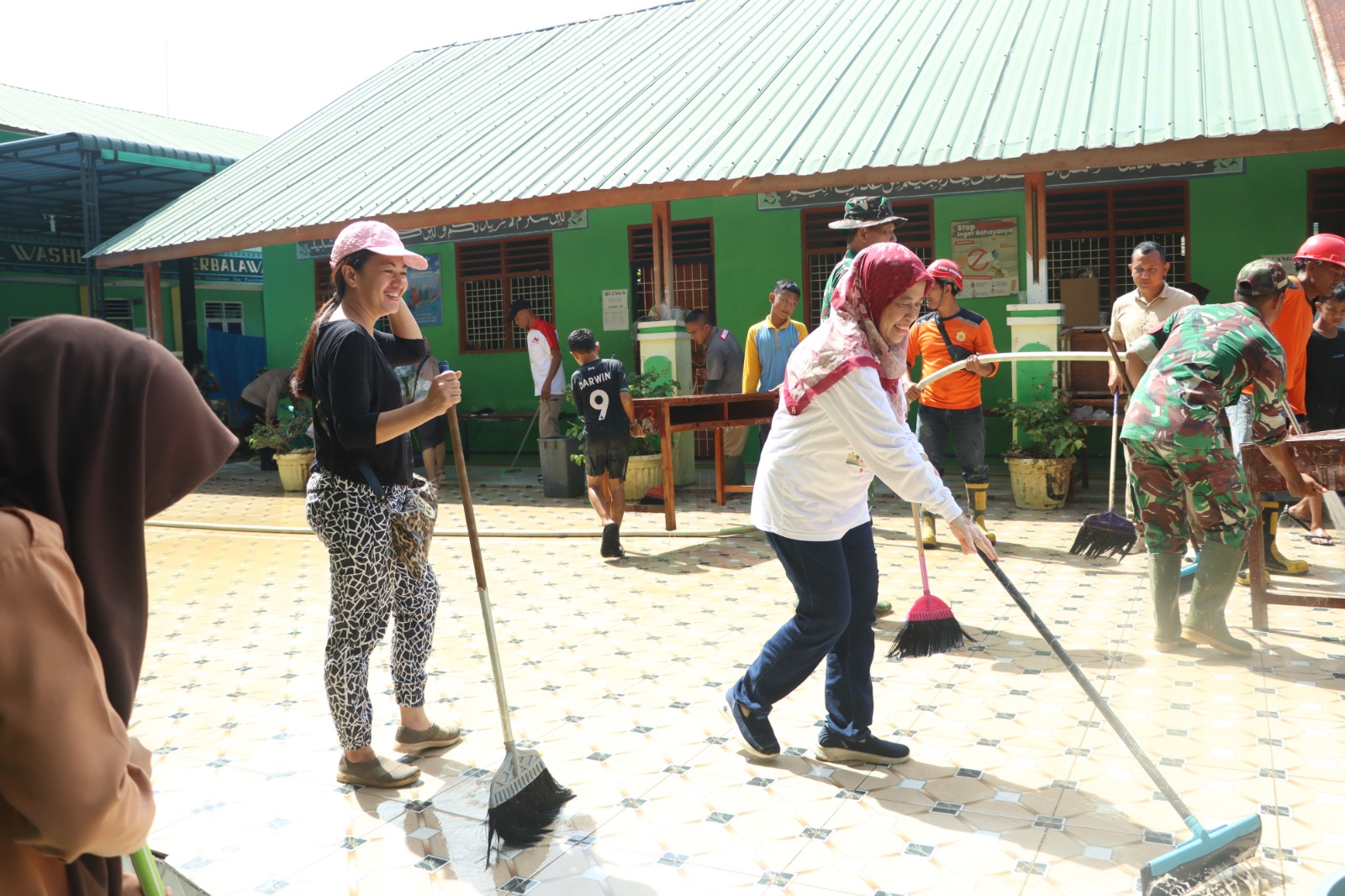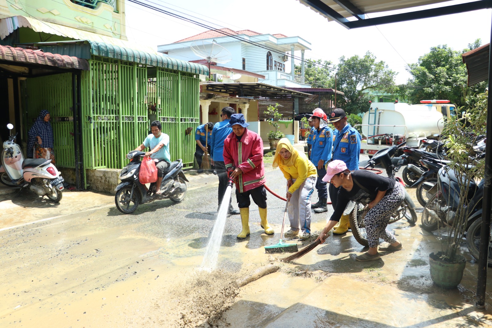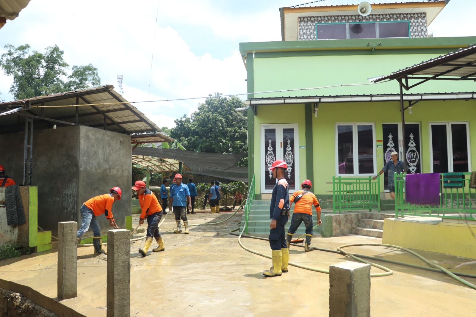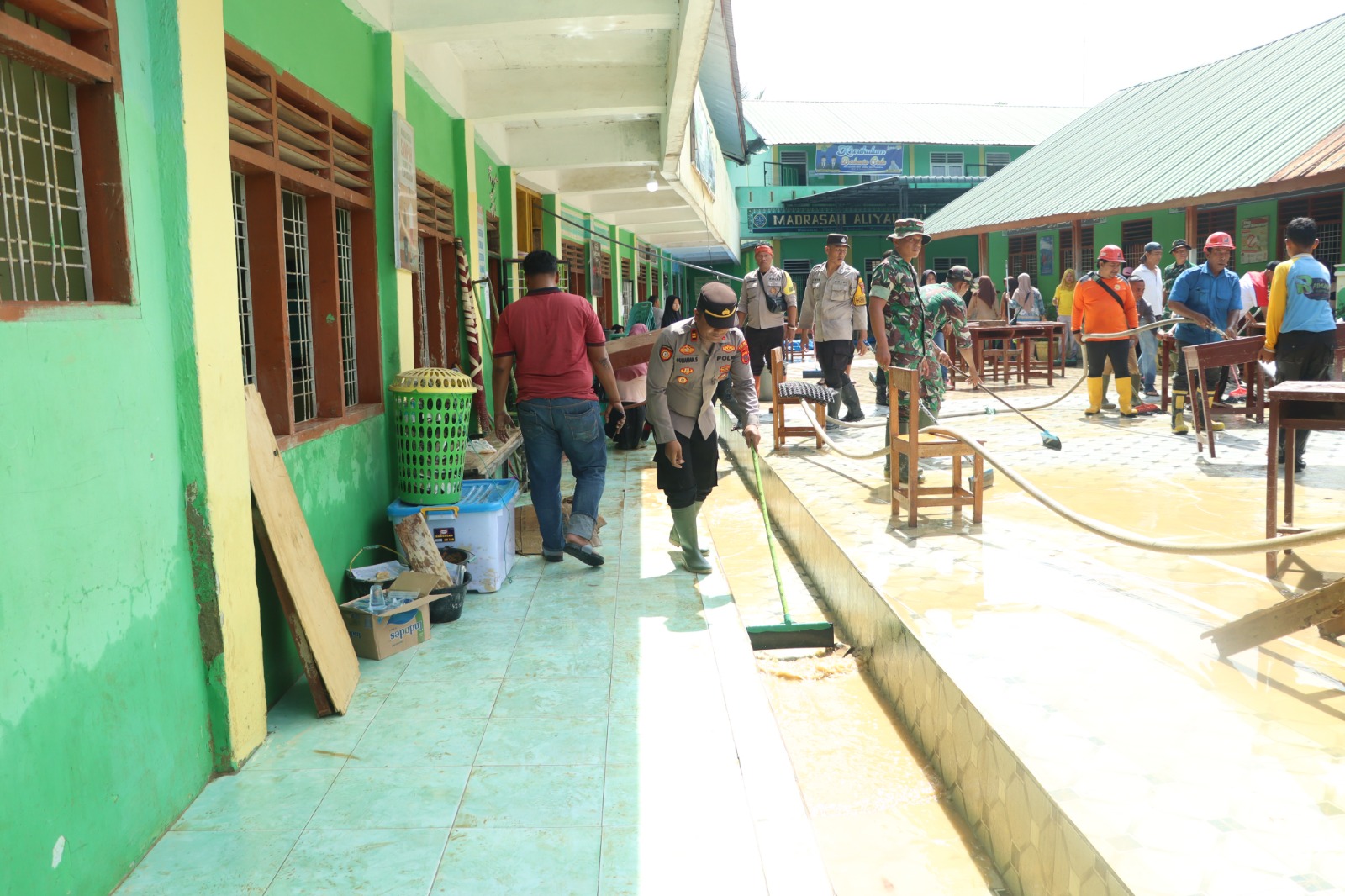 Pembersihan menyasar rumah warga, masjid, sekolah Al Wasliyah, dan jalan yang terdampak banjir.