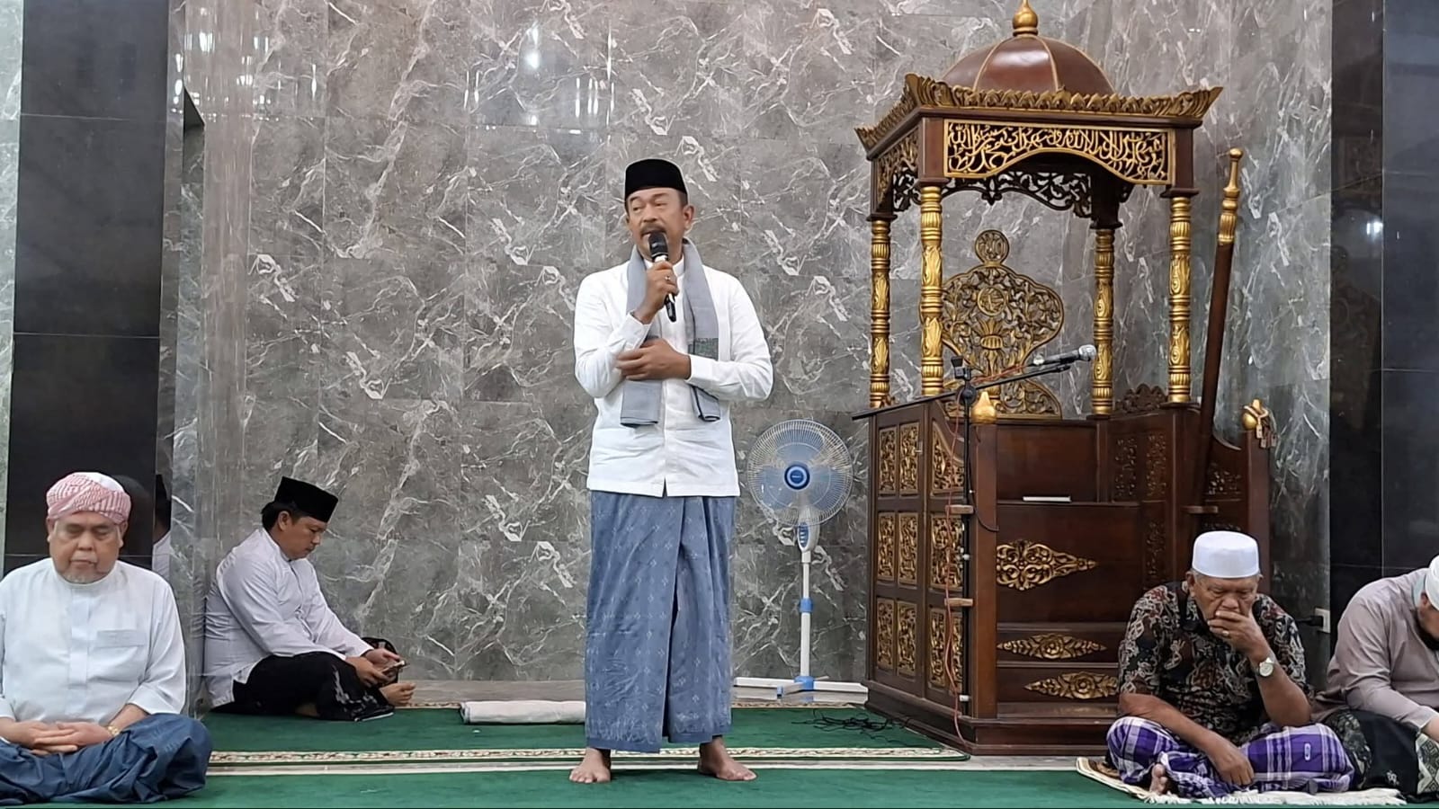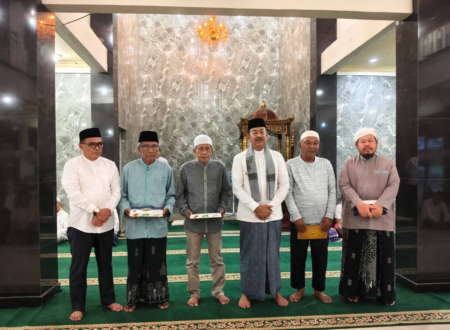 Usai Safari Subuh, Bupati Madina H.Saipullah Nasution menyerahkan kain sarung pada jamaah.(Id100)