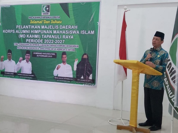 P.SIDEMPUAN (Waspada): Penasehat Majelis Wilayah (MW) Korps Alumni Himpunan Mahasiswa Islam (KAHMI) Sumatera Utara, H. Syahrul M. Pasaribu, hadir dan menyampaikan orasi kebangsaan di pelantikan MD KAHMI Tapanuli Raya (Tapara).