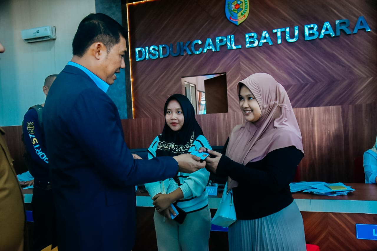 INDRAPURA (Waspada): Penjabat (Pj) Bupati Batubara H. Heri Wahyudi Marpaung, S. STP, M.AP menyerahkan KTP Elektronik bagi para pemula di Kantor Dinas Dukcapil Jalinsum Indrapura, Kecamatan Air Putih, Senin (25/11).