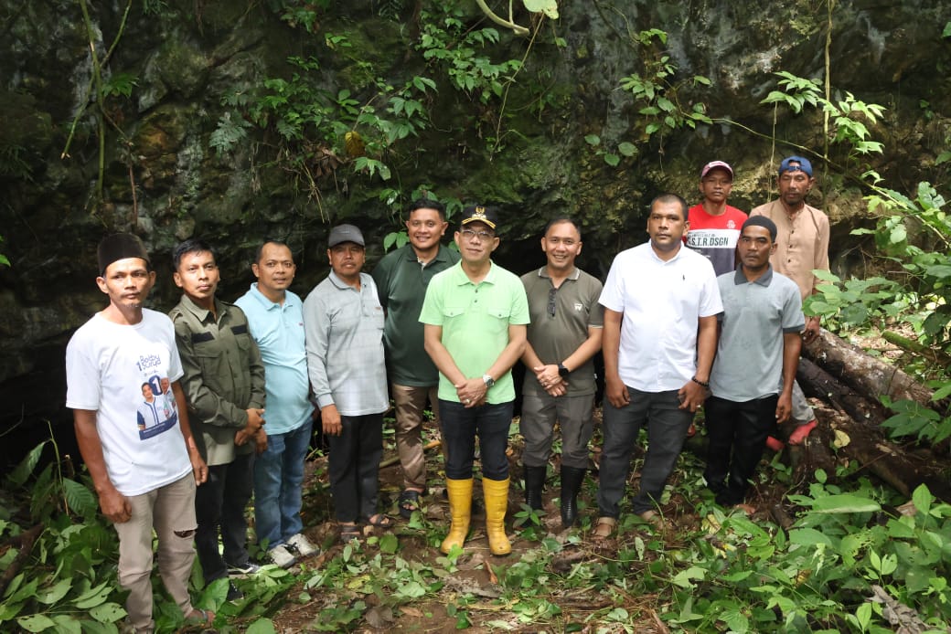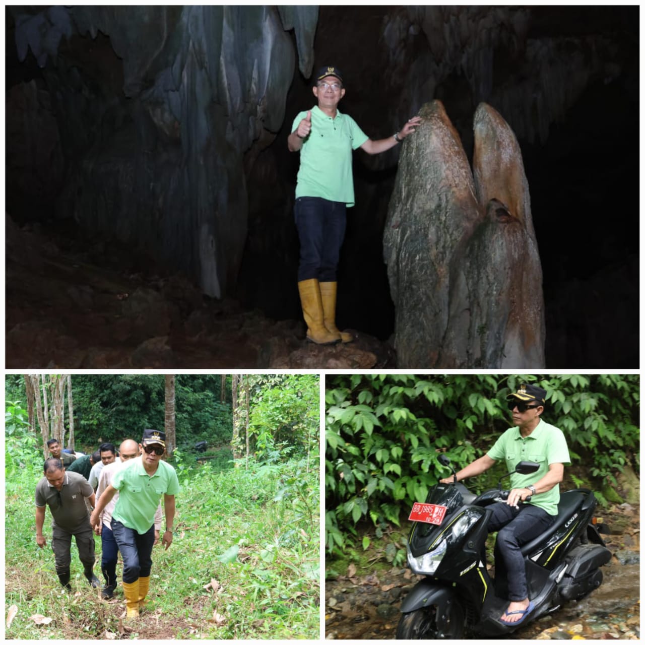 TAPSEL (Waspada): Bupati Tapanuli Selatan, Gus Irawan Pasaribu, terkagum-kagum melihat potensi alam berupa gua stalaktit di Desa Aek Badak Julu, Kecamatan Sayurmatinggi, Minggu (18/5/2025) siang.