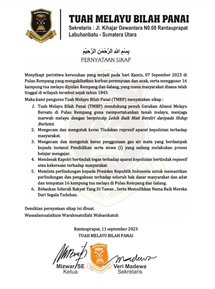 Sikap penolakan ini di sampaikan melalui pernyataan sikap majelis TMBP Kabupaten Labuhanbatu yang diterbitkan tanggal 11 September yang berbunyi antara lain, menyatakan dukungan penuh Gerakan Aliansi Melayu Bersatu di pulau Rempang guna mempertahankan tanah Melayu, marwah Melayu dengan berprinsip “Lebih baik mati berdiri daripada hidup berlutut”.