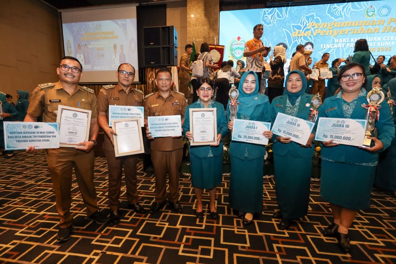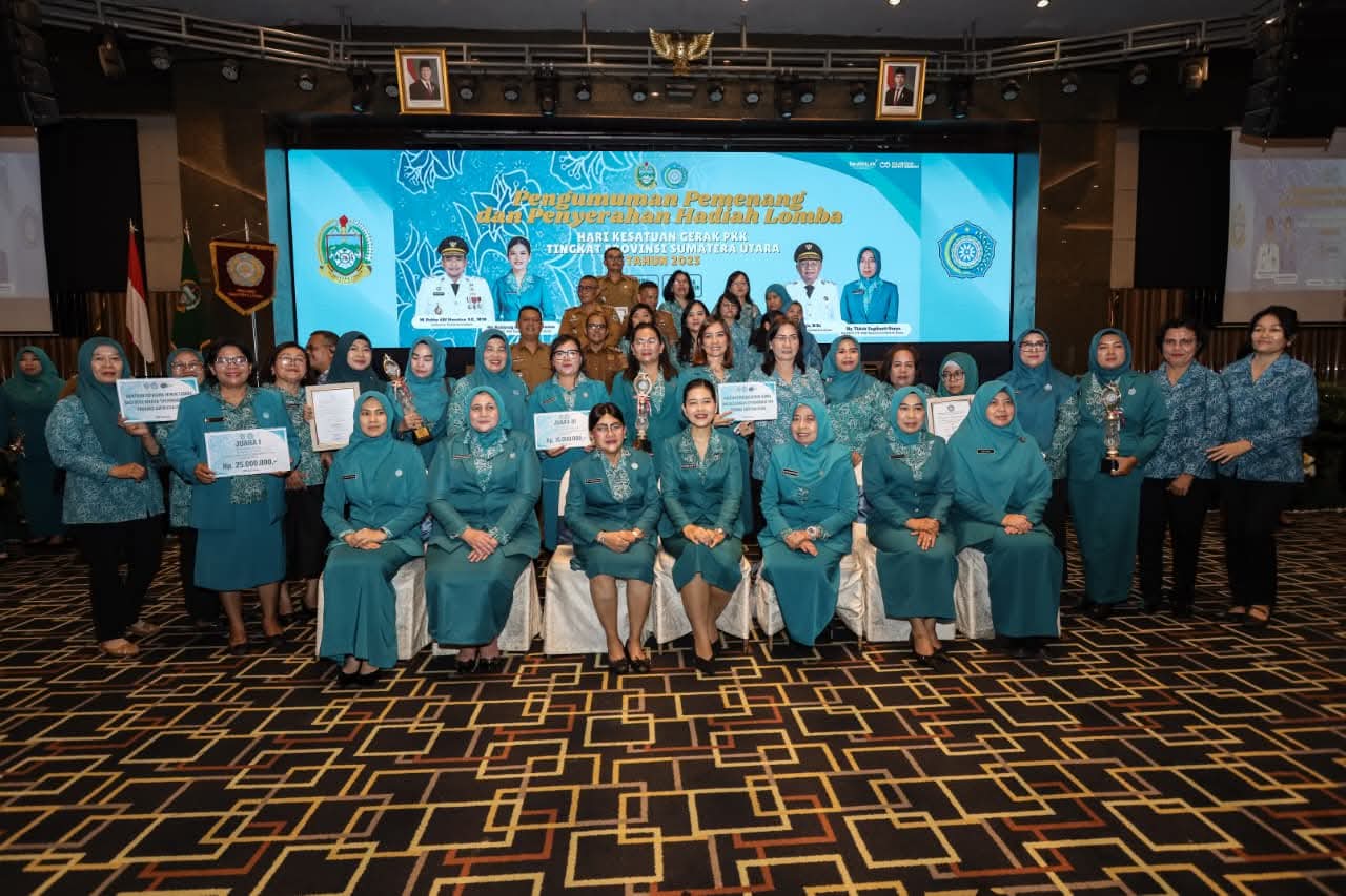 PEMATANGSIANTAR (Waspada.id) – TP PKK Kota Pematangsiantar, di bawah kepemimpinan Ny Liswati Wesly Silalahi, meraih prestasi gemilang di tingkat Provinsi Sumatera Utara (Sumut) dengan memenangkan tiga kategori lomba dalam rangka Hari Kesatuan Gerak (HKG) PKK Tingkat Provinsi Sumut Tahun 2025. Pengumuman dan penyerahan hadiah berlangsung di Ballroom Hotel Grand Mercure, Medan, Kamis (06/11/2025).