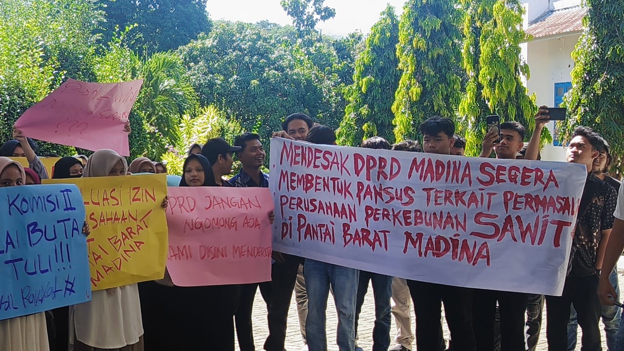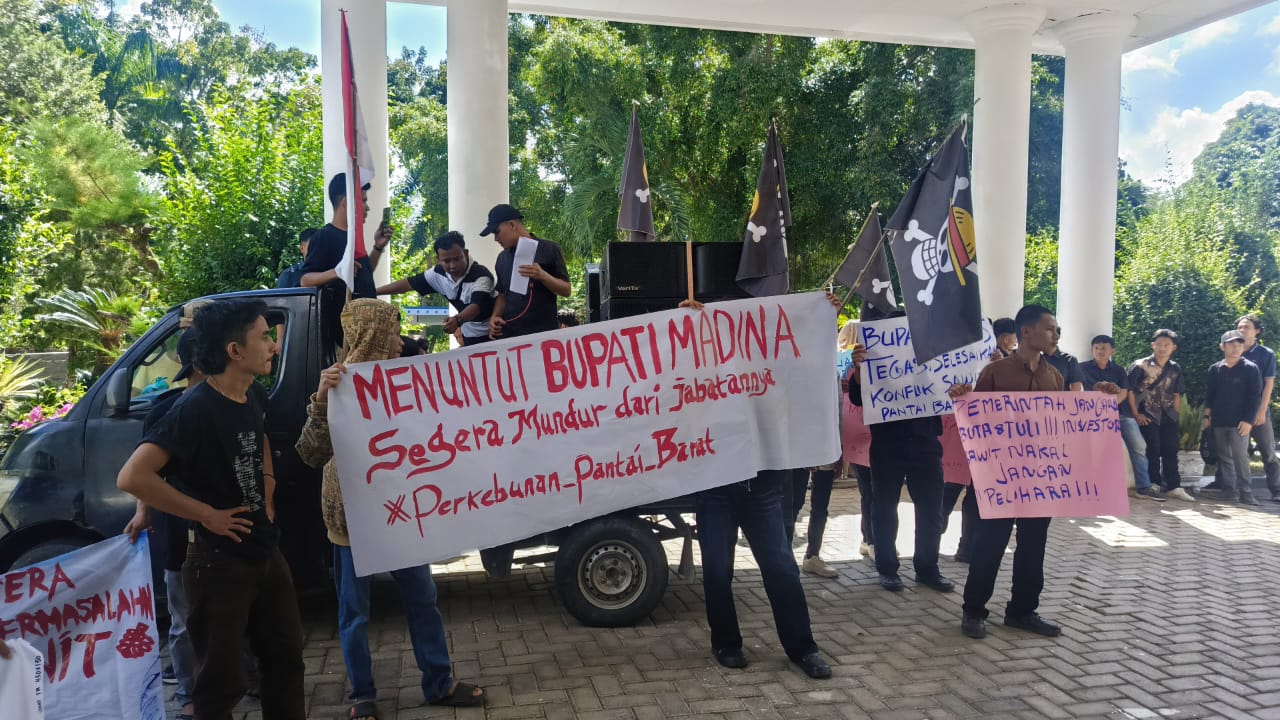 PANYABUNGAN (Waspada.id): Ratusan masyarakat yang tergabung dalam Aliansi Mahasiswa Pemuda dan Masyarakat Reformasi Mandailing Natal (Madina) menggelar aksi unjuk rasa di kantor DPRD dan Bupati Madina, Senin (03/11/2025). Aksi ini menyoroti berbagai permasalahan perkebunan di wilayah Pantai Barat Madina.