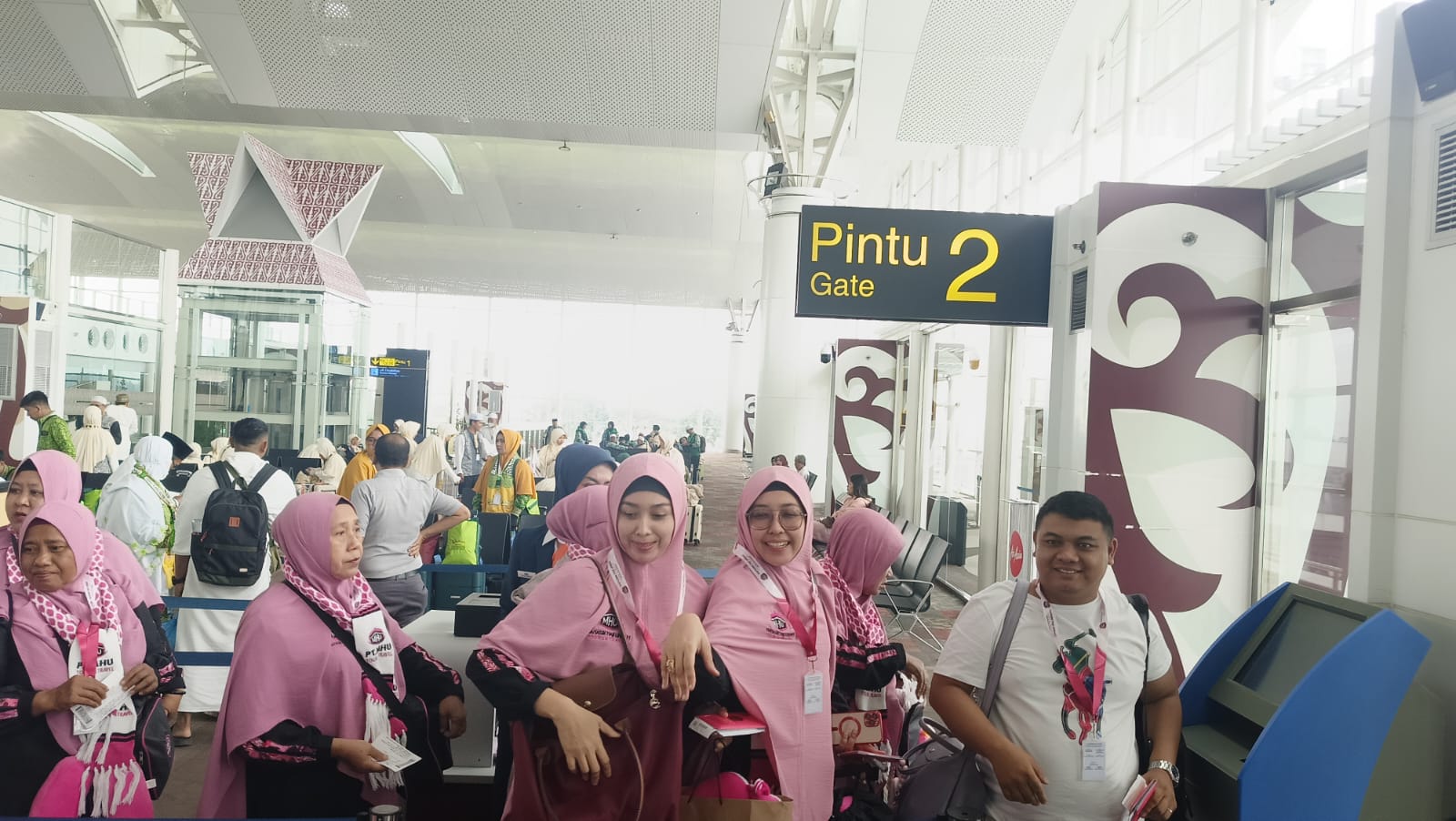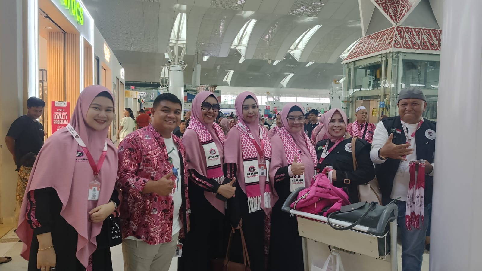 DELISERDANG (Waspada.id): Pasangan suami isteri warga Binjai yang pada 9 Desember 2025 lalu melangsungkan pernikahannya di Kualalumpur, Malaysia, menunaikan ibadah umrah bersama keluarganya, Minggu (28/12/2025) siang. Mereka berangkat dengan pesawat Lion Air, JT084 rute Kualanamu-Jeddah.