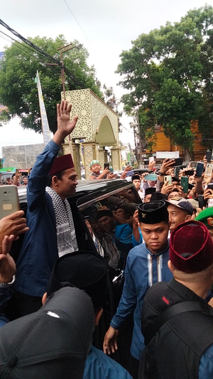 Keteramgan poto: Ustadz H Abdul Somad melambaikan tangan ketika memasuki Mesjid Agung(Waspada/Ist).
