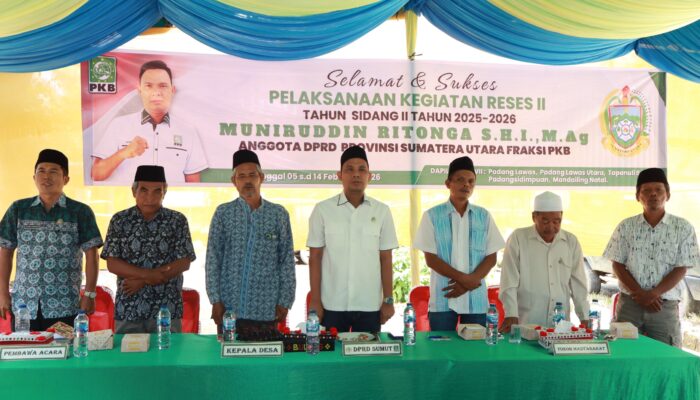 TAPANULI SELATAN (Waspada.id): Anggota DPRD Provinsi Sumatera Utara dari Partai Kebangkitan Bangsa (PKB), Muniruddin Ritonga, S.H.I., M.Ag, menggelar Reses II Tahun Sidang II 2025–2026 di Desa Gunung Baringin/Mosa, Kecamatan Angkola Selatan, Kabupaten Tapanuli Selatan, Senin (9/2).