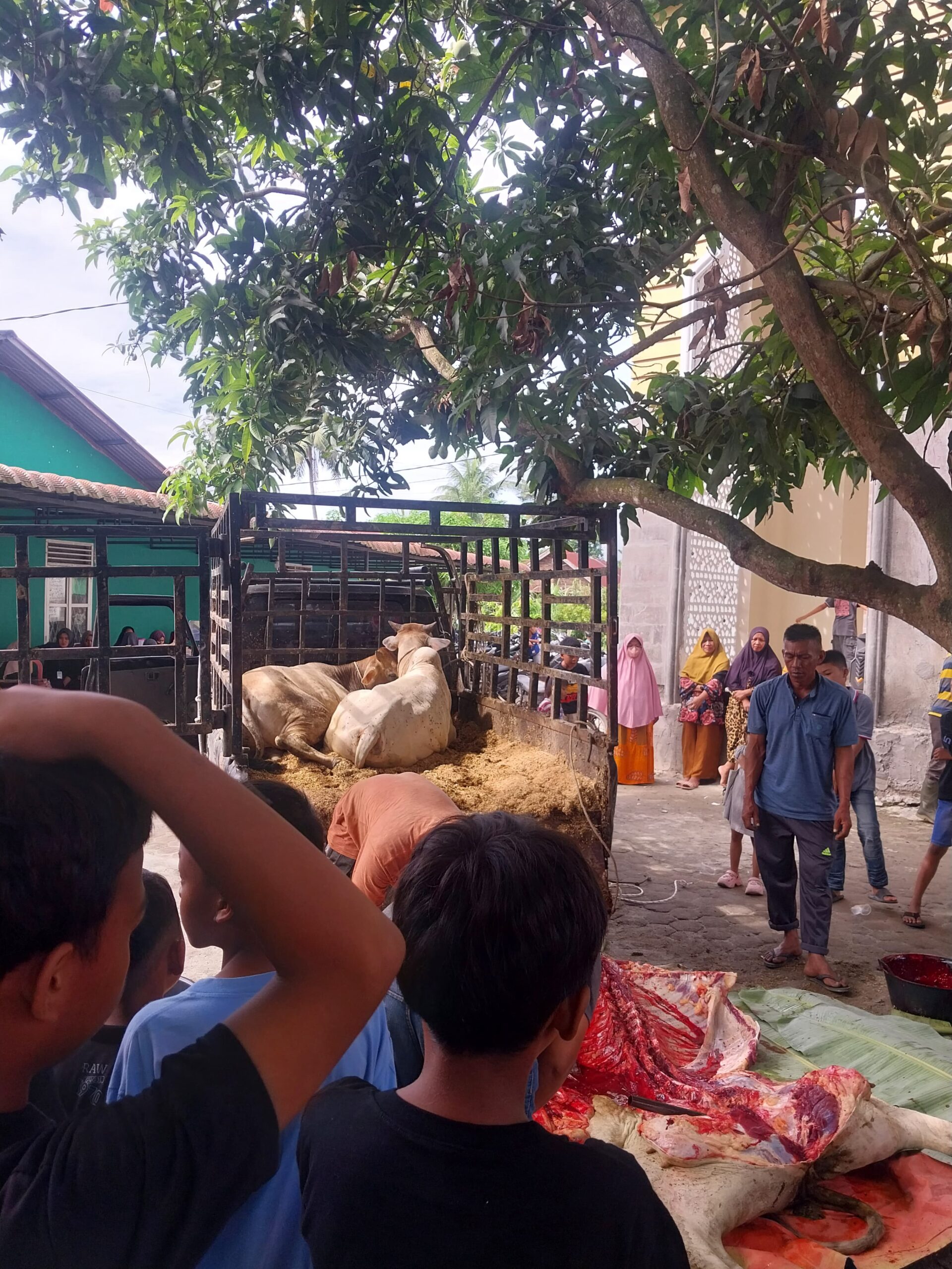 DELISERDANG (Waspada): Masyarakat Dusun Mesjid, Desa Beringin, Kecamatan Beringin, Kabupaten Deliserdang melakukan pemotongan hewan kurban untuk memeriahkan perayaan Idul Adha 1446 H, Sabtu ( 7/6/25).